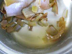 ・鍋にアロエの葉とひたひたになるくらいの水を加えて火にかける。沸騰したら弱火にし、30分コトコト煮る。