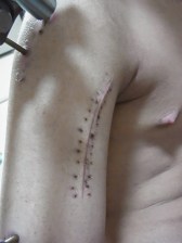 こんなふうに手術をした後、縫い目付近の皮膚は皮下組織と癒着して硬くなってしまいます。これは時間が経っても改善しません。ひきつれて腕が上がらなくなったり、痛みが出て動かしにくくなったりします。