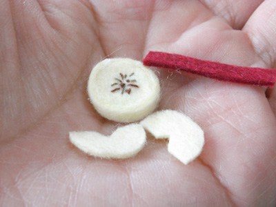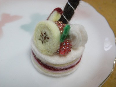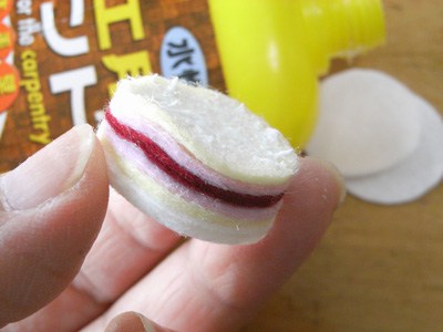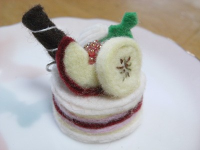 作り方はUPしませんが、途中経過はこんな感じです。 こんなふうにフェルトを切り出してボンドで貼り付けます。スポンジの間にはイチゴ&ラズベリージャムをはさんでっと