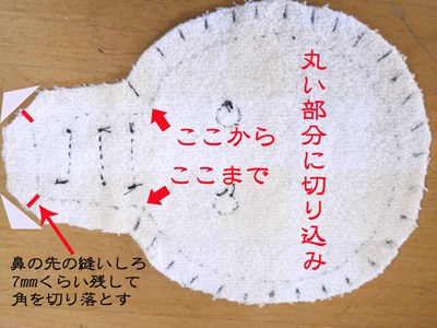 鼻先を縫ってひっくり返したとき、キレイに鼻の隅が四角い形になるように、鼻先の縫いしろを両端を三角形に切り落とします。 出来上がり線よりも7mmくらい離れたところを切ってくださいね。そうしないと、ほつれてしまいます。 それから、顔と鼻の境目のところに切り込みを入れ、そこからずっと頭部の丸みに沿って1.5cm間隔くらいに切込みを入れます。