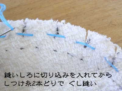 顔がキレイな丸い輪郭になるように加工します。 切込みを入れた顔の丸い部分の縫いしろを、二本取りのしつけ糸でぐし縫いします。