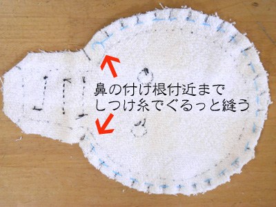 鼻の付け根付近から反対側の同じ位置まで、ぐるっと縫ってください。