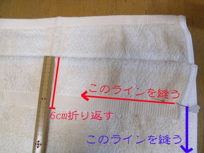 ここが、袋の口の部分です。 袋の口の部分からタオルを折ったところまで、タオルの両サイド(青い↓ライン)を2回ぐし縫いします。