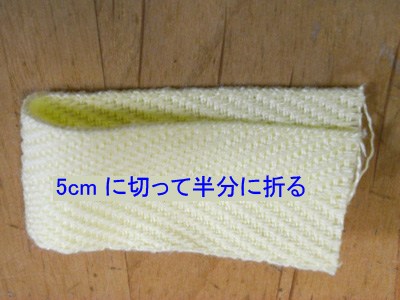 次に、マチ(底)を作ります。 袋の口の紐はそのままショルダーになるので、紐をくくりつけるための面テープを作ります。面テープを5cmに切って半分に折って下さい。(左右分として2コ作ります)