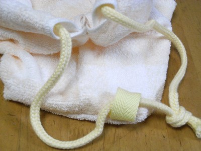 ゴム通しを使って、袋の右から面ロープを通し、マチにつけた面テープにロープを一本通して縛ります。 同じように左から面ロープを通して、ロープの先を縛って下さい。