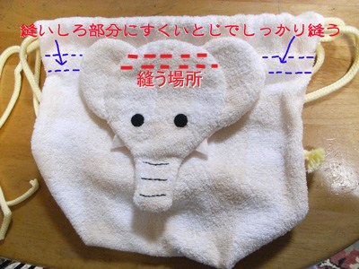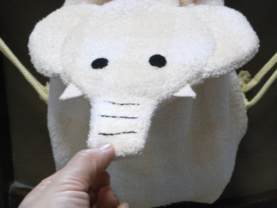 背中にしょって歩いた時、ぞうさんの耳と鼻がぱくぱく動くところが可愛いので、全体を縫い付けないでね。