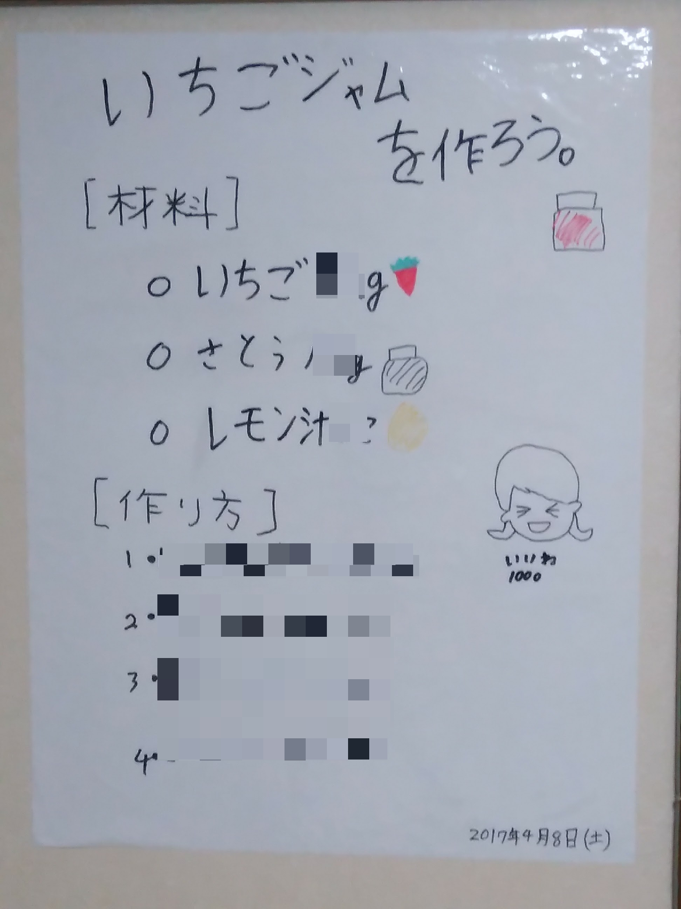 春休みで暇をもてあましていた「息子2(二人兄弟の弟)」の手を借りて、「簡易ホワイトボード」にレシピを書きました。