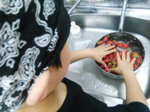 実習は【イチゴを煮る】ところから始めたかったので、イチゴを洗って「へた(葉っぱ)をとる取るところまで「下準備」をしました。