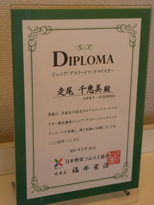 第一関門の「ジュニア・アスリートフードマイスター」修了試験に合格して、終了証をいただきました。