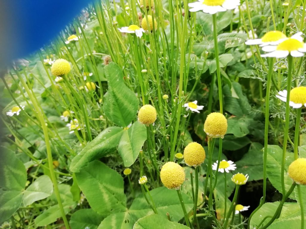 きいろいポンポンみたいなハーブは、心の安らぐカモミールです。